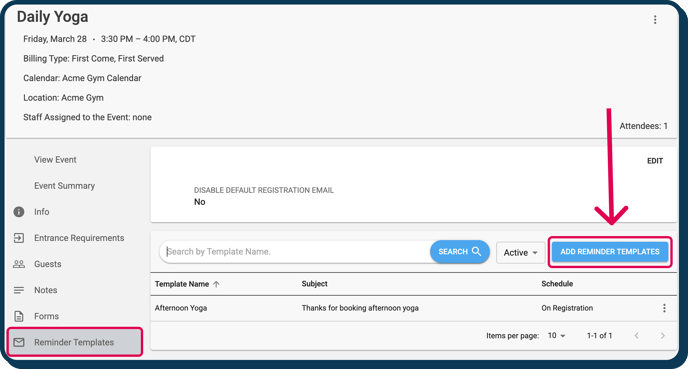 Now it is time to add your template to an event or booking. You can add as many templates as you would like to any event or booking. This gives you the ability to have custom registration emails, multiple reminders, as well as follow up emails. - To add a template, navigate to the event or booking of your choosing and click "Reminder Templates" followed by the blue "Add Reminder Templates" button.