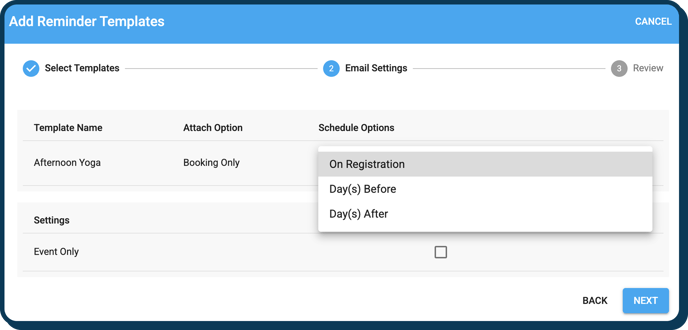 - You can NOT schedule templates to send on registration from the booking level of a multiday event. Only "Day(s) Before" and "Day(s) After".