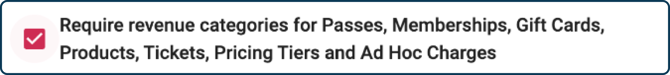 This setting requires a revenue category to be chosen when creating a new asset (memberships, passes, gift cards, products, tickets, pricing tiers, and ad hoc charges.