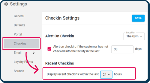 The "Recent Checkins" is defaulted to show the last 4 hours. This can be adjusted anywhere between 1-24 hours from the "Settings" tab under "Checkins".