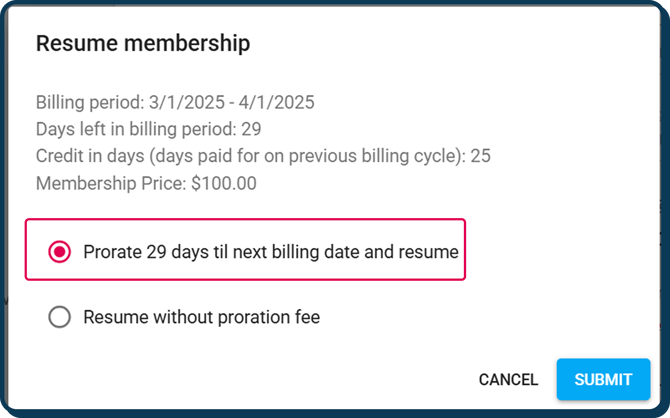 If you place a membership on hold part way through the billing cycle (let's say, 15/30 days), the hold will recognize that amount of days paid for and not used (15), and when the membership is taken off of hold and prorated, that proration fee is reduced by the number of days that were paid for and not used (15).