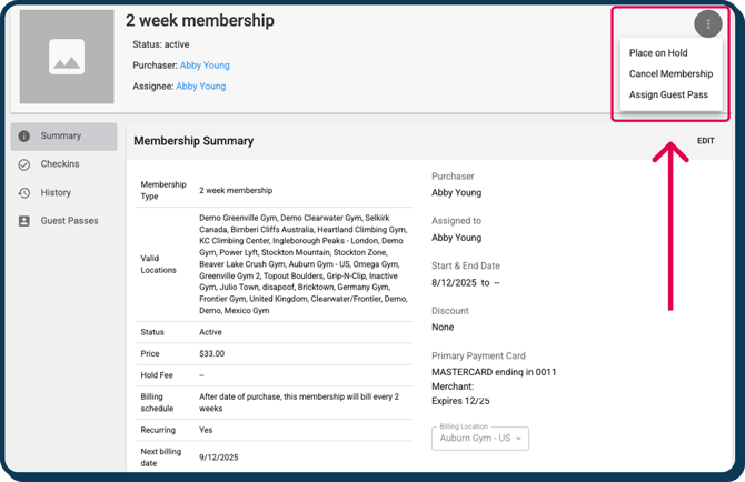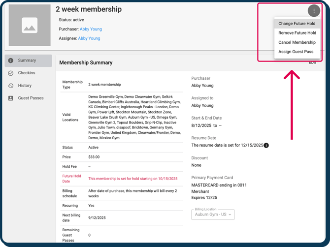 - To set a future hold date, go to the membership and click the three dots in the top right corner > "Place On Hold."