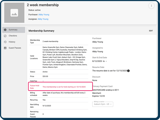 - You will see on the membership summary it displays that the membership is set to go on hold at a future date.