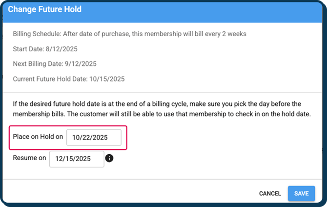 IMPORTANT NOTE: If you sell a membership with a future start date and schedule a hold to begin the day before that start date/bill date, the system will not automatically place the membership on hold. This is because the hold automation only applies to memberships that have already started — it does not process holds for memberships with start dates in the future.
