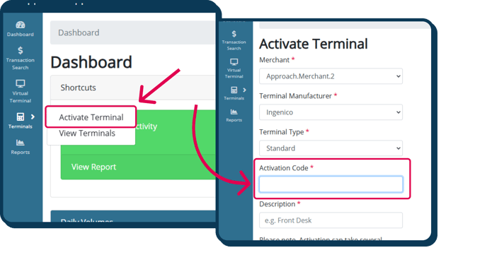 - Click "Terminals", then click "Activate Terminal". You'll enter the Activation Code, including the letter "P" and ensure the remaining information is correct. The Description can be anything you choose.