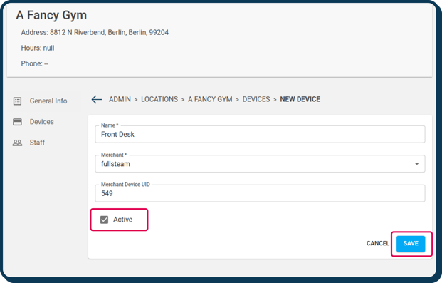 - Ensure the Device fields are completed properly. Paste the Terminal ID you got from MerchantTrack in the Merchant Device UID field. Ensure the Active checkbox is checked, then hit save.