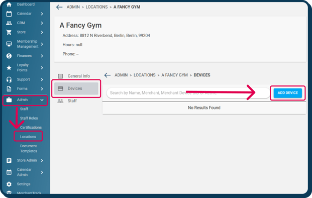 - Navigate back to your tab with the Approach Main App. Click on Admin, then Locations. Select the location this device is for, then click Devices.